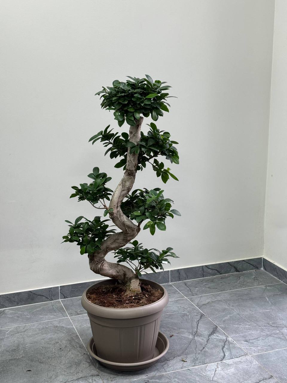 Унікальна багаторівнева бонсай-форма фікуса мікрокарпа з S-подібним звивистим стовбуром та кількома ярусами компактних крон. Дрібне овальне листя темно-зеленого кольору з глянцевою поверхнею, розміром 2-4 см. Потовщений скульптурний стовбур створює ефектну композицію. Кожен ярус крони сформований окремо.