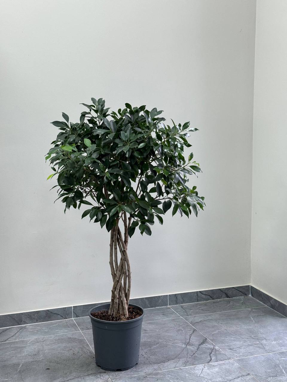 Унікальна бонсай-форма фікуса з потовщеним причудливим коренем, що виступає над поверхнею ґрунту, та компактною кроною з дрібним овальним листям. Коріння нагадує скульптуру або людську фігуру. Листя темно-зеленого кольору, глянцеве, розміром 2-4 см. Повільний ріст дозволяє легко контролювати форму.