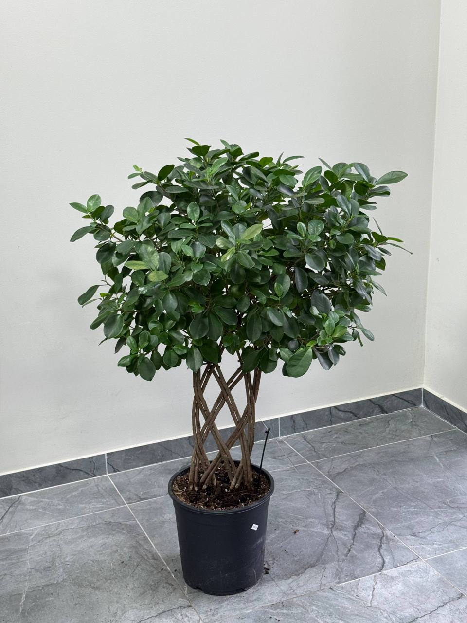 Витончене декоративне дерево з дрібним глянцевим листям та ефектним стовбуром, сформованим у техніці плетіння макраме у вигляді решітки. Кілька молодих стовбурів переплетені у складний геометричний візерунок, що створює ажурну конструкцію. Густа крона з поникаючими гілками та яскраво-зеленим листям.