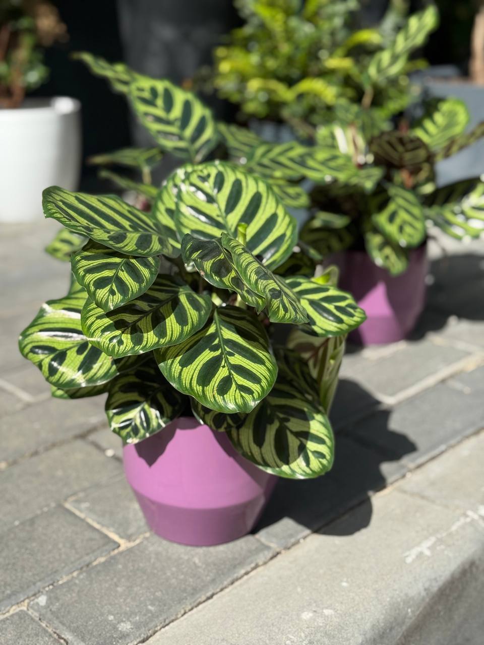 Декоративна тропічна рослина з ефектним візерунчастим листям овальної форми. Листові пластини з унікальним малюнком – темно-зелений фон з сріблясто-зеленими овальними плямами вздовж центральної жилки, темними смугами вздовж бічних прожилок та пурпурною нижньою стороною. Розмір листя 15-20 см. Вечірньої пори листя піднімається вертикально, демонструючи пурпурну сторону – рослина “молиться”.