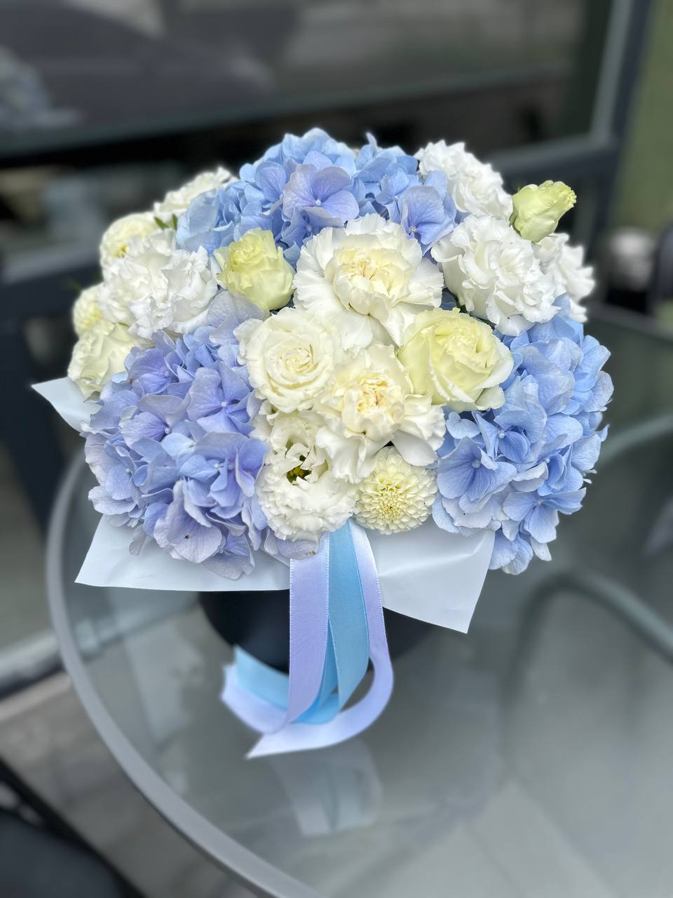 Гортензія3шт Еустома-4шт Гвозика-5шт Коробка -L