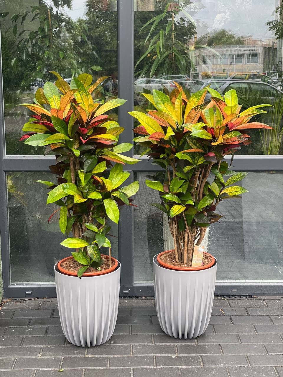 Декоративна рослина на штамбі з яскравим різнобарвним листям овальної або лопатевої форми. Листові пластини щільні, шкірясті, з унікальним поєднанням зеленого, жовтого, помаранчевого, червоного та пурпурного кольорів. Візерунок жилок контрастний. Штамбова форма – пряме деревце з кулястою кроною на верхівці.