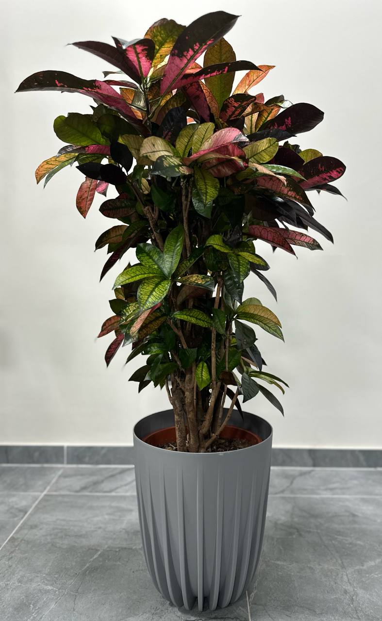 Яскрава декоративна рослина з різнобарвним листям ефектного забарвлення. Листові пластини щільні, шкірясті, з глянцевою поверхнею, поєднують пурпурні, рожеві, жовті, помаранчеві, зелені та бордові відтінки. Форма листя ланцетоподібна. Багатостовбурова композиція створює пишний об’ємний кущ. Представлена у стильному рифленому сірому кашпо.