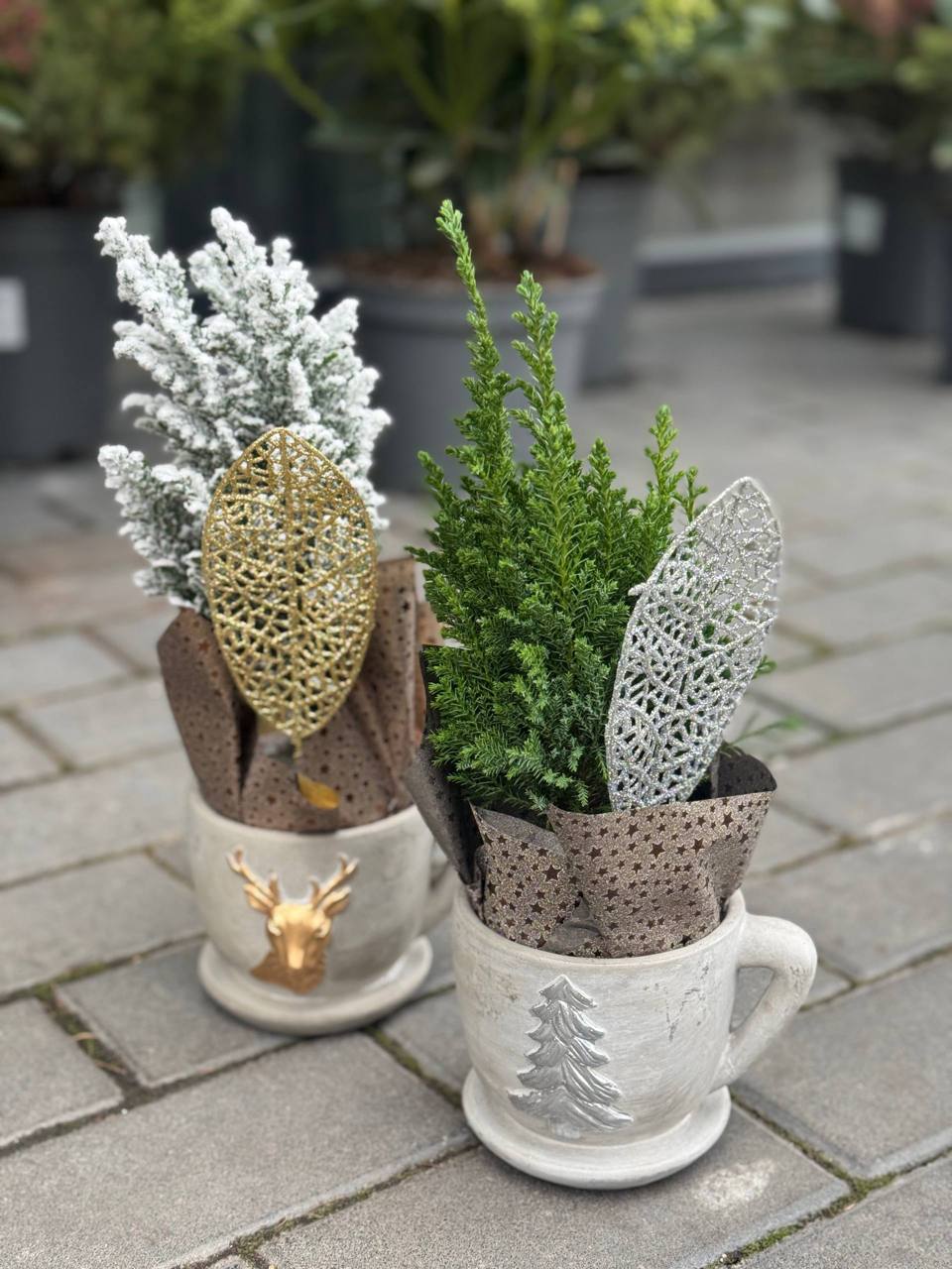 Святкова композиція з мініатюрних хвойних рослин у декоративних керамічних чашках з новорічним декором. Кипарис або туя засніжена з білим декоративним напиленням та кипарисовик зеленого кольору. Доповнені ажурними декоративними шишками золотого та сріблястого кольору, імітаційним снігом та фігурками. Компактні рослини висотою 15-25 см у святкових кашпо з блюдцями.