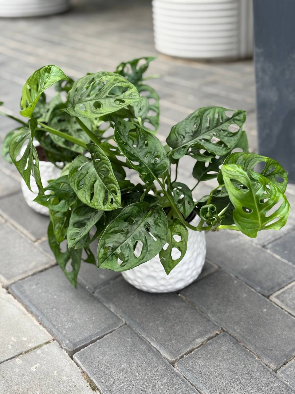 Компактна ліаноподібна рослина з ажурним листям, пронизаним численними отворами та розрізами. Листові пластини серцеподібної форми, яскраво-зеленого кольору, розміром 10-20 см. Пагони гнучкі, швидко розростаються – за сезон додають 50-70 см довжини. Представлена у білому фактурному кашпо.