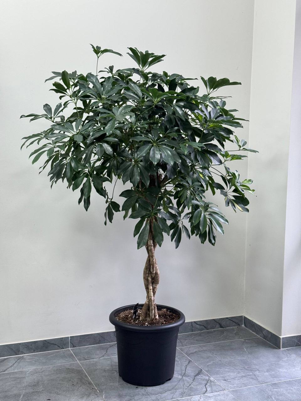 Декоративне деревце штамбової форми з характерним пальчасто-складним листям, що нагадує парасольку. Листові пластини глянцеві, зібрані по 7-9 сегментів на одному черешку, темно-зеленого кольору або з жовтими плямами у строкатих сортів. Штамбова форма – прямий стовбур з кулястою кроною на верхівці.