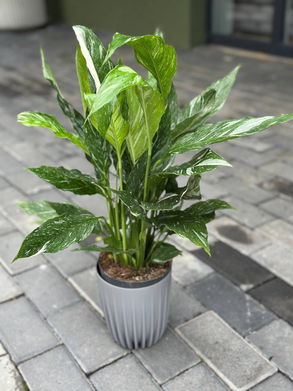 Вишукана квітуча рослина з глянцевим темно-зеленим листям та білими покривалами-квітами. Листові пластини широколанцетоподібні з хвилястими краями та виразними прожилками, довжиною 20-30 см. Квіти складаються з білого покривала і жовтуватого початка. Цвітіння може тривати цілий рік за належного догляду. Компактна форма куща.