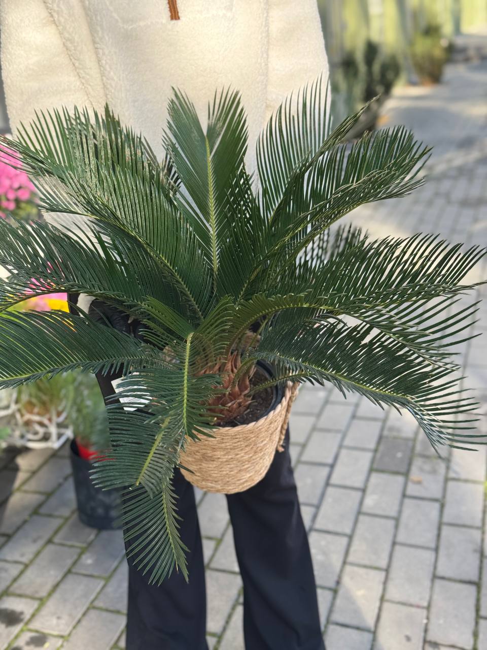 Реліктова рослина з розеткою жорсткого перистого листя, що нагадує пальму або папороть. Повільний ріст – за рік з’являється лише 1-3 нових листки. Центральний стовбур потовщений, вкритий лусочками. Представлений у стильному джутовому кашпо.