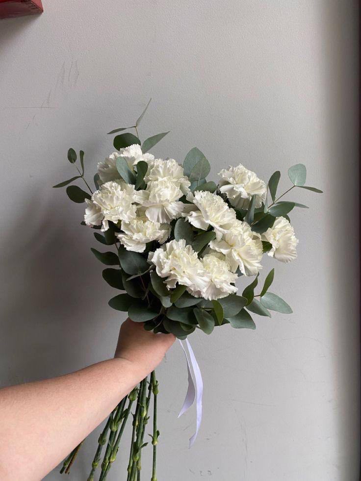 Весільний букет поєднання білих гвоздик і евкаліпту
